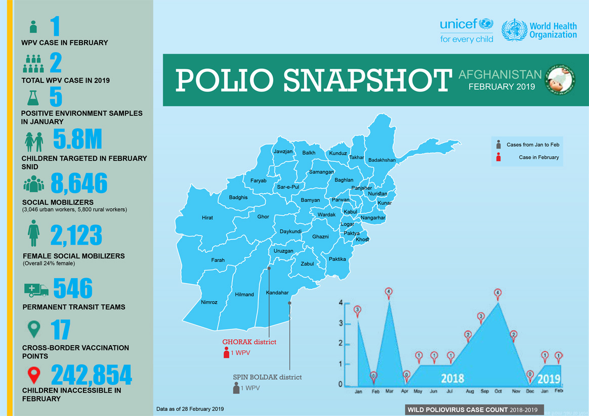 In November, polio vaccination teams across Afghanistan targeted 5.3 million children under the age of five in high-risk provinces. The vaccination campaign came on the heels of several newly reported cases. Afghanistan has 19 documented cases of wild poliovirus in 2018, as of November. Confirmation of even one polio case anywhere signals remaining vaccination coverage gaps which must be filled to achieve eradication.